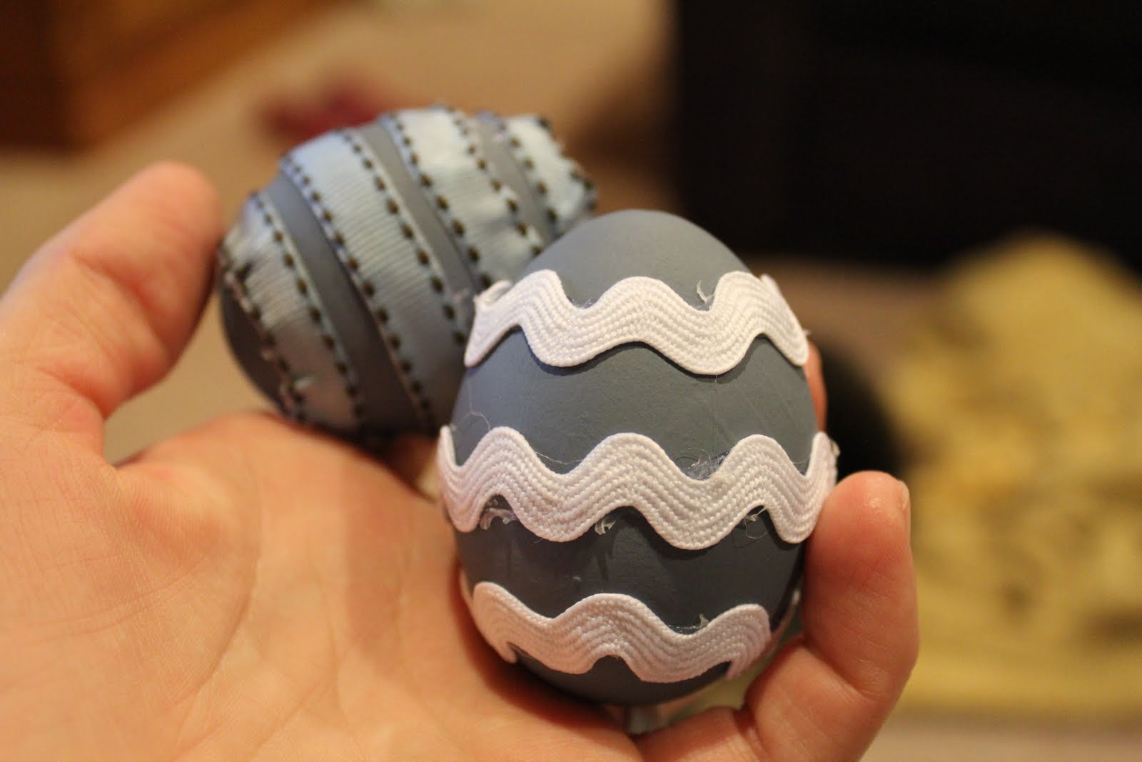 I wanted to try to hot glue some ribbon around some of the eggs, too. The rick-rack worked a lot better than the grosgrain: